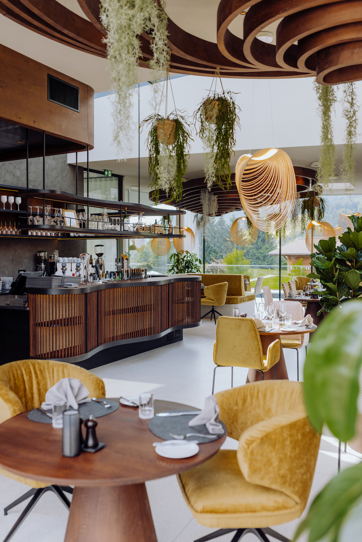 Auch das Design des Gourmetrestaurants unterstreicht die Balance zwischen Natur und menschlichem Tun. Schlichte Klarheit und poetische Anmut verbinden sich im Ess:enz nicht nur auf dem Teller, sondern auch unter dem Pflanzendach des würfelförmigen Gebäudes. Unangestrengt zeigen sich Präzision und Sinnlichkeit in der lichten Architektur mit vielen Fenstern. Sie verleiht dem Ess:enz den passenden (Frei)Raum für Manuel Pallaschkes preigekrönten Garden of Eating (u.a. 2 Hauben Gault Millau, 91 Fallstaff-Punkte und 3 Fallstaff-Gabeln).