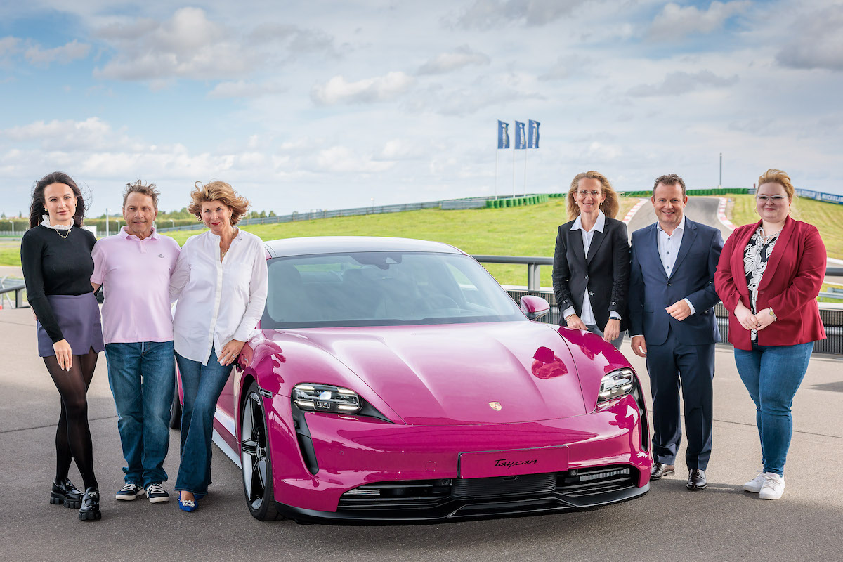 Bild: Maxi Fenger, Richy Müller, Vivian Honert-Boddin, Dr. Claudia Nerius, Gerd Rupp und Sophia Hoffmann (v.l.n.r.) vor dem diesjährigen Hauptpreis der Spendentombola zugunsten der Stiftung „Leipzig hilft Kindern“: ein Porsche Taycan in der Farbe „Sternrubin“.